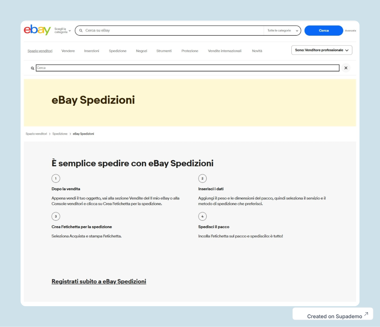 Gestire tutte le fasi della spedizione da un unico pannello: ordini, pagamenti, spedizioni e tracciamento. Non è necessario utilizzare strumenti esterni: ogni fase del processo è coordinata direttamente su eBay, rendendo il flusso più rapido e semplice. - Spedire in Italia e all’estero