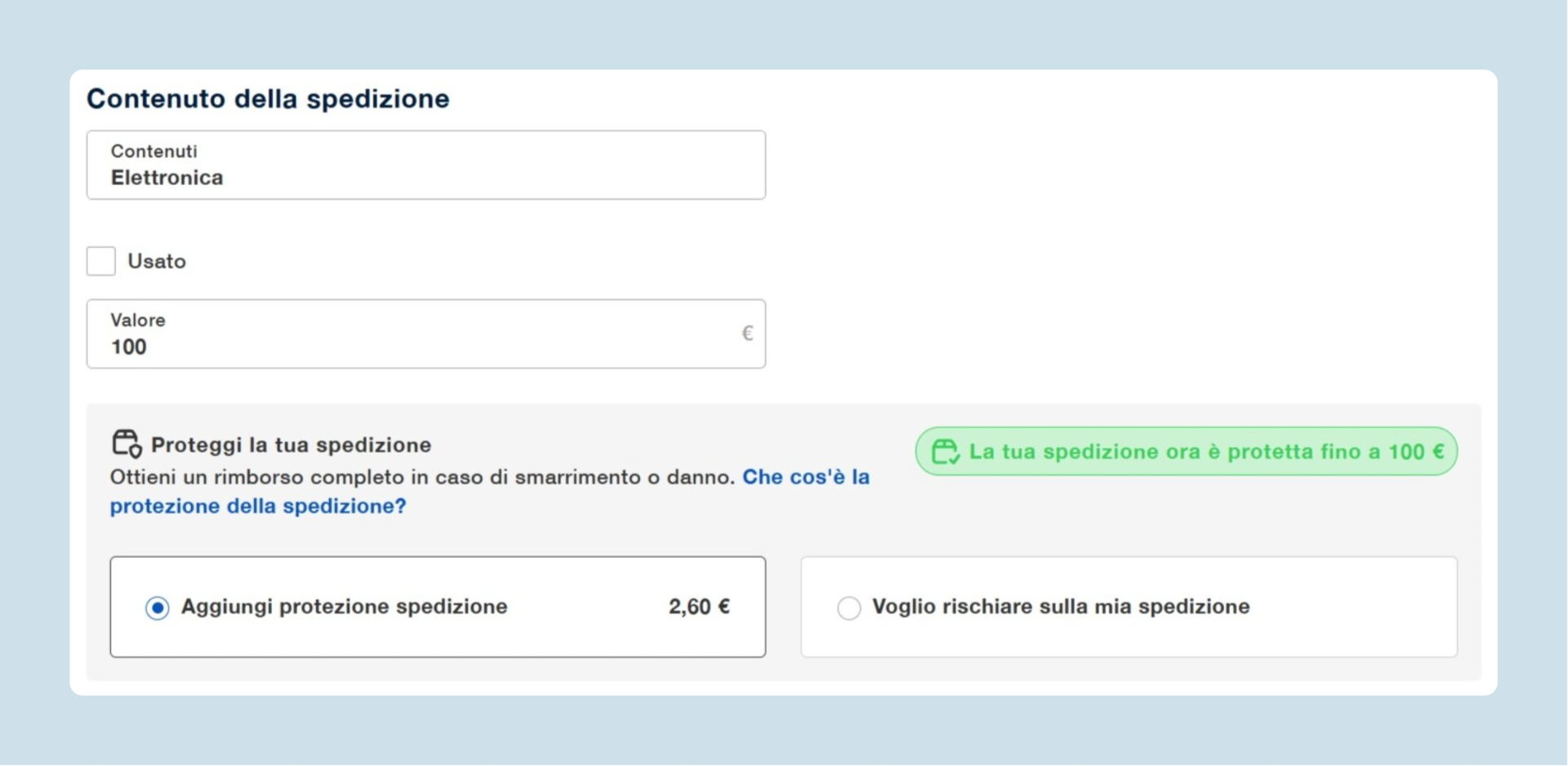 - Se il valore dell’oggetto è superiore, è possibile acquistare una copertura assicurativa aggiuntiva per aumentare la tutela in caso di smarrimento o danneggiamento dell'oggetto.