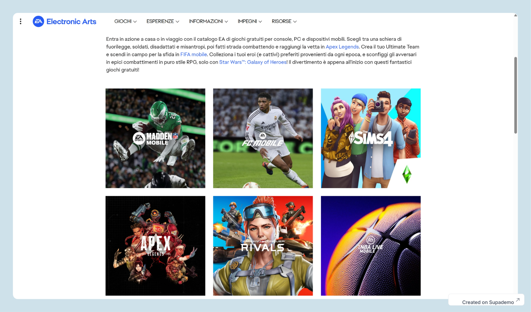 Sul sito ufficiale di EA - Electronic Art è disponibile una sezione di giochi Free-to-Play da poter giocare. I titoli possono essere scaricati e giocati gratuitamente su PC, console e dispositivi mobili. Si tratta di giochi Free-to-Play, quindi non richiedono un acquisto iniziale, ma all'interno del gioco potrebbero esserci acquisti opzionali, che permettono di sbloccare contenuti extra, come skin, personaggi, oggetti o vantaggi speciali.