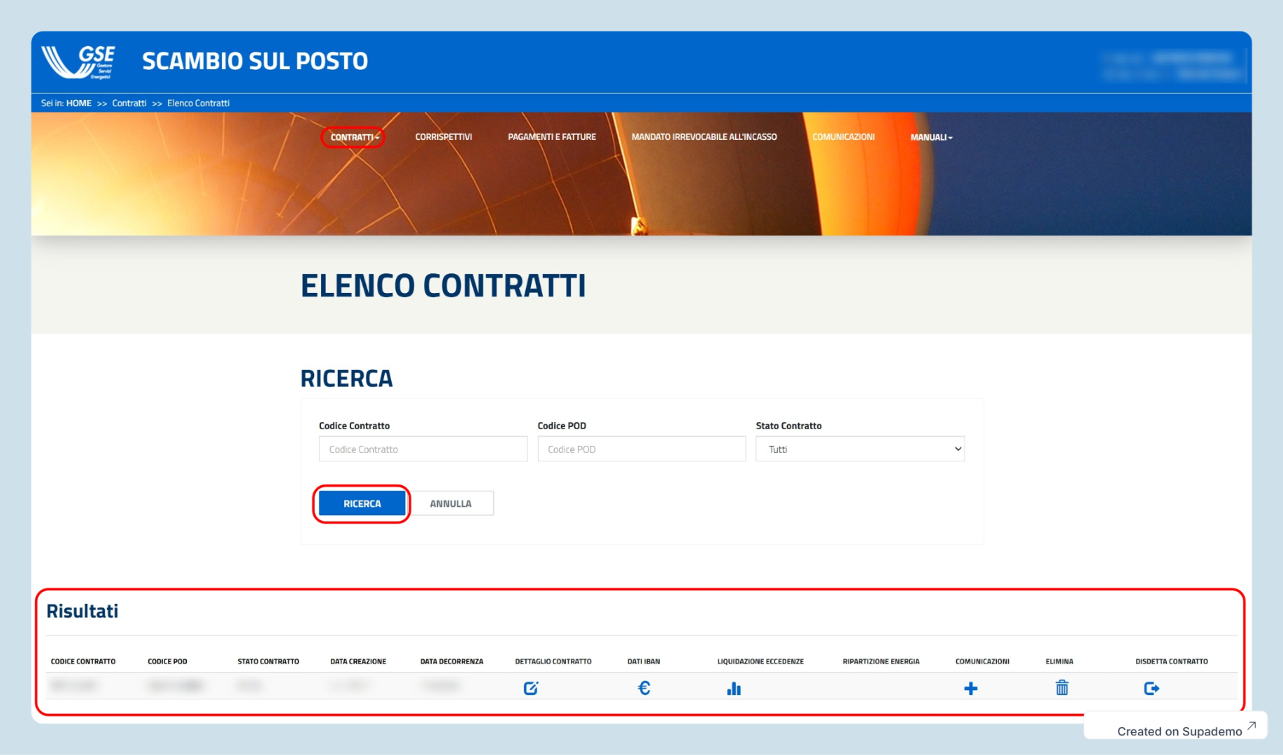 - Cliccare su Ricerca per visualizzare tutti i contratti intestati