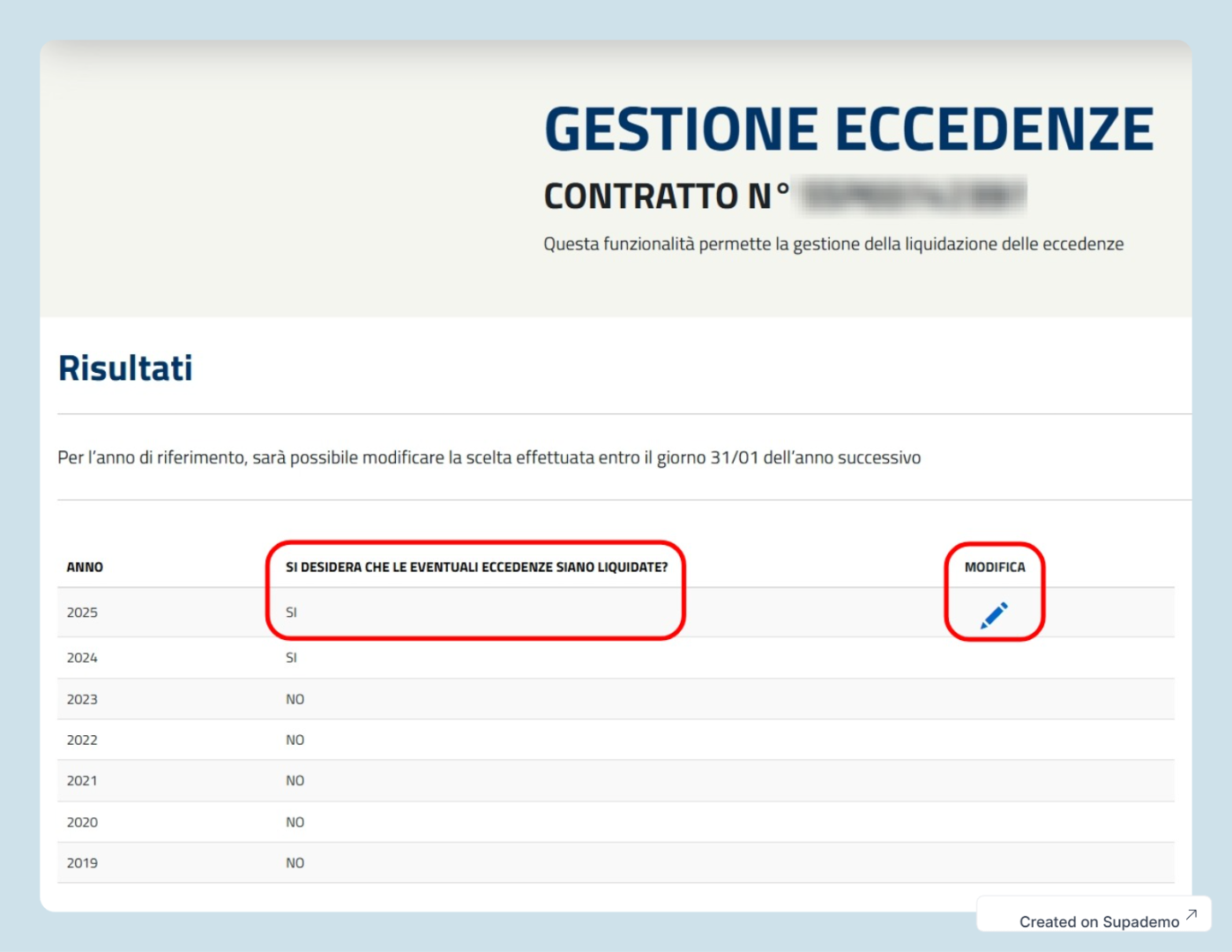 - Accedere alla sezione “Gestione Eccedenze” e verificare che, per l’anno di riferimento, l’opzione di liquidazione delle eccedenze sia impostata su “Sì”. In caso contrario, andare su “Modifica” e aggiornare l’impostazione.